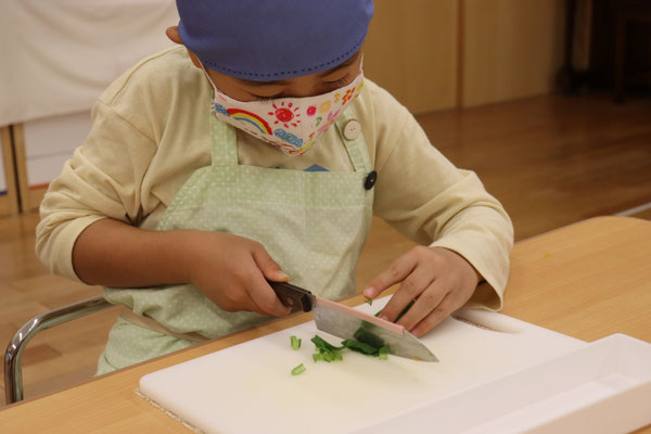 Aさんのクッキングのお当番さんに切ってもらい、給食の時間に美味しく食べることができました。